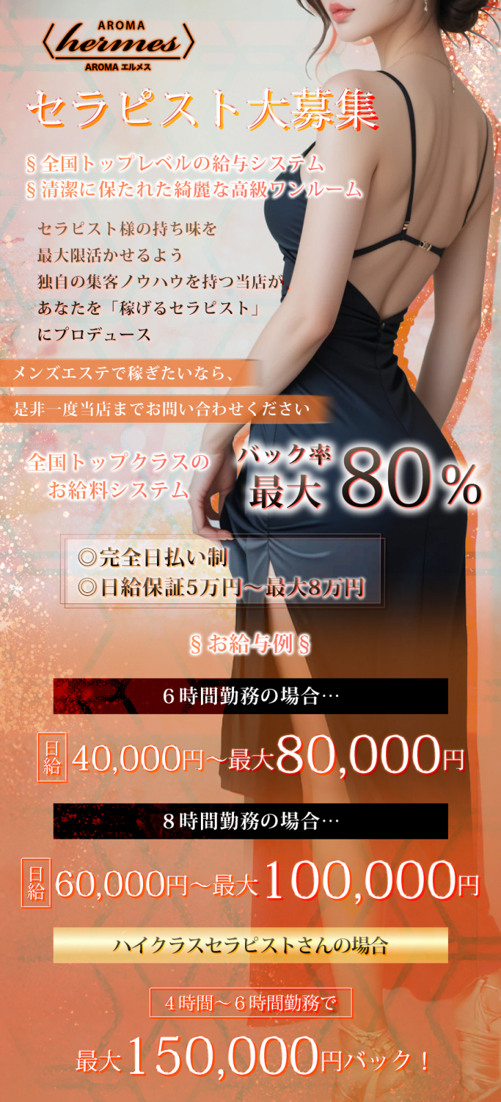 | 給与 | 報酬5万円~8万円/日 給与 ・コース料金の50%以上(※ご経験により応相談) ・指名・オプションは100%のフルバック! ・全額日払いでお持ち帰り可能です! 計算してもらえれば圧倒的に稼げる理由がわかります! |