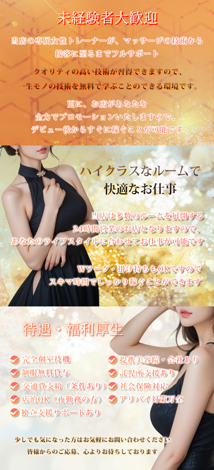 | 待遇 | お給料は料金の50%以上バック(※ご経験によって応相談) ・指名・オプションは100%のフルバック ・全額現金当日のお支払い ・制服貸与あり ・ボタニスト等のリッチなシャンプー&トリートメント完備 ・サロニアのコテ完備 ・Wi-Fi完備 ・電子レンジ完備 ・綺麗な高級マンション ・掛け持ち ・Wワーク大歓迎 ・お引越し斡旋可 ・勤務先対策 ・アリバイ対策 ・マイナンバー対策 その他、生理用品などアメニティ完備してます! その他詳しくはお問い合わせください。 |
